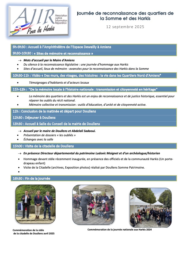 L’association AJIR a le plaisir d’annoncer un événement exceptionnel qui se tiendra le 12 septembre 2025 : une Journée de Reconnaissance dédiée aux quartiers de la Somme et aux Harkis. Cette journée vise à mettre en lumière l’histoire, la mémoire et les contributions de ces communautés à travers des témoignages poignants et des échanges enrichissants.